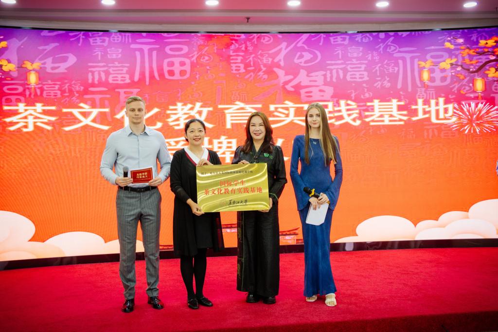 活动伊始,国际文化教育学院院长姜涛向大发茶城董事长周敏授牌,共建茶文化教育实践基地并约定深化合作。