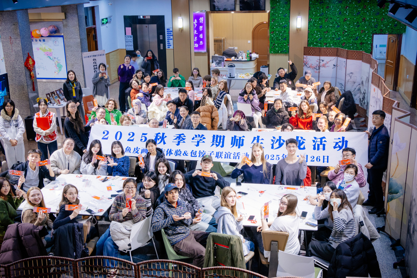 获哈尔滨市文联支持,活动特邀省级鱼皮画制作技艺传承人石立新老师莅临讲座,以鱼皮画这一珍贵传统技艺为纽带,搭建起中外师生感知非遗魅力的桥梁。在专家悉心授课中,中外学子与教职工共同探寻鱼皮画背后的匠心传承,在创作中体悟中华优秀传统文化的温度与底蕴,推动非遗文化在跨文化交流中落地生根。这一环节既是学院深耕民族民俗文化传播的具体举措,也是将传统文化教育融入来华留学生心理健康教育的创新尝试。