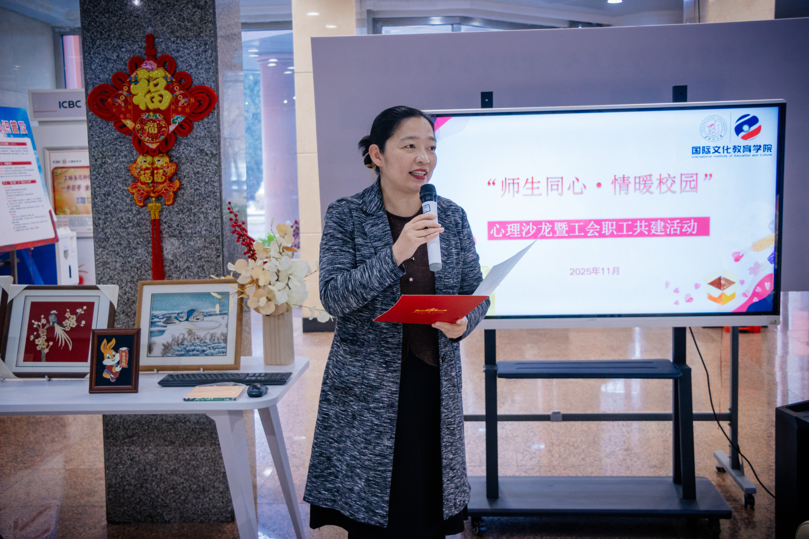 为推进高水平教育对外开放,落实留管工作服务国家对外开放,近日,国际文化教育学院以“师生同心・情暖校园”为主题,举办师生心理沙龙暨工会职工共建活动。活动将非遗文化传承、心理健康教育、工会职工共建深度融合,既彰显“一院一品”建设特色,又为学校民族民俗基地建设注入鲜活动能,成为践行学校国际化办学战略、深化跨文化育人的生动实践。