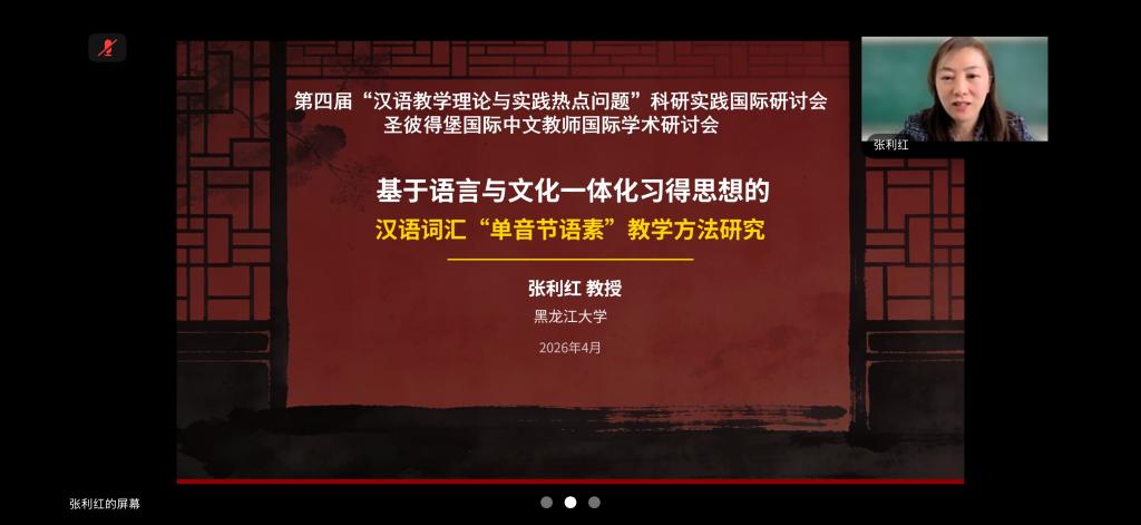 4月15日,由黑龙江大学与圣彼得堡国立经济大学联合主办的第四届“汉语教学理论与实践热点问题:高等教育与中学教育合作”国际科研实践会议在圣彼得堡国立经济大学成功举办。此次会议汇聚了来自中俄两国的100多位专家学者与汉语教师。我院张利红教授、杨微副教授分别受邀参会作主旨报告、专题培训。两位老师凭借多年积累的深厚学科积淀与丰富的实践经验,在会议中精彩发言,充分展现了我院在国际中文教育学科建设上的坚实基础和高水平的教学科研水准。